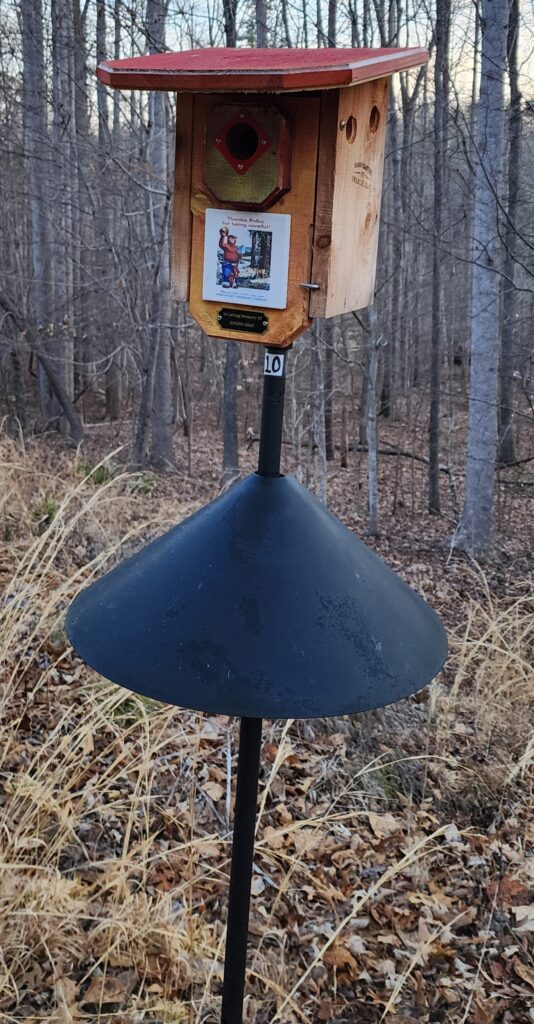 Predator guards on posts are essential to protect eggs, nestlings and incubating parents from climbing predators. To be effective against raccoons, a conical baffle (also called a Jensen-Arndt or “coolie hat” coon guard) needs to be at least 3 feet in diameter. Note that even this size does not deter large snakes (over five feet long) well. Conical baffles may be harder to make, more expensive, and less effective than a stovepipe baffle, and sharp edges can be a problem around children and during monitoring. Some raccoons learn to get around them. However, they are probably the easiest baffle to put up when a nestbox is mounted on a wooden post.